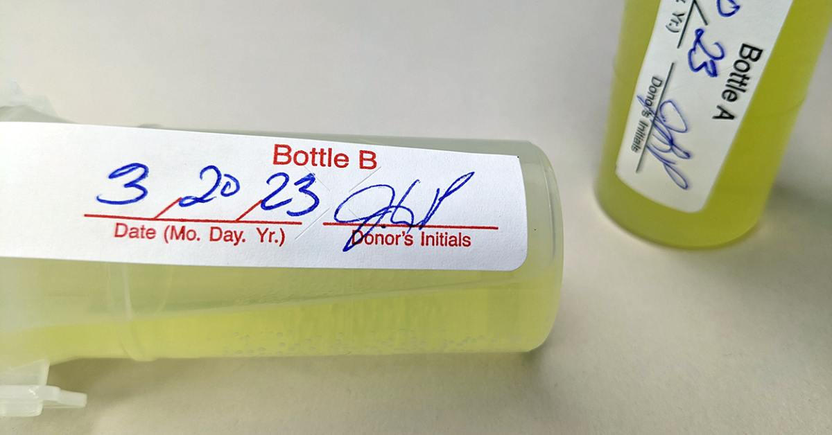 You must place the tamper-evident seals from the form over the caps of both bottles. These seals prove that no one opened the bottles after the donor provided the specimen sample. You should date the security seals and then ask the donor to initial the seals once you have placed them securely.